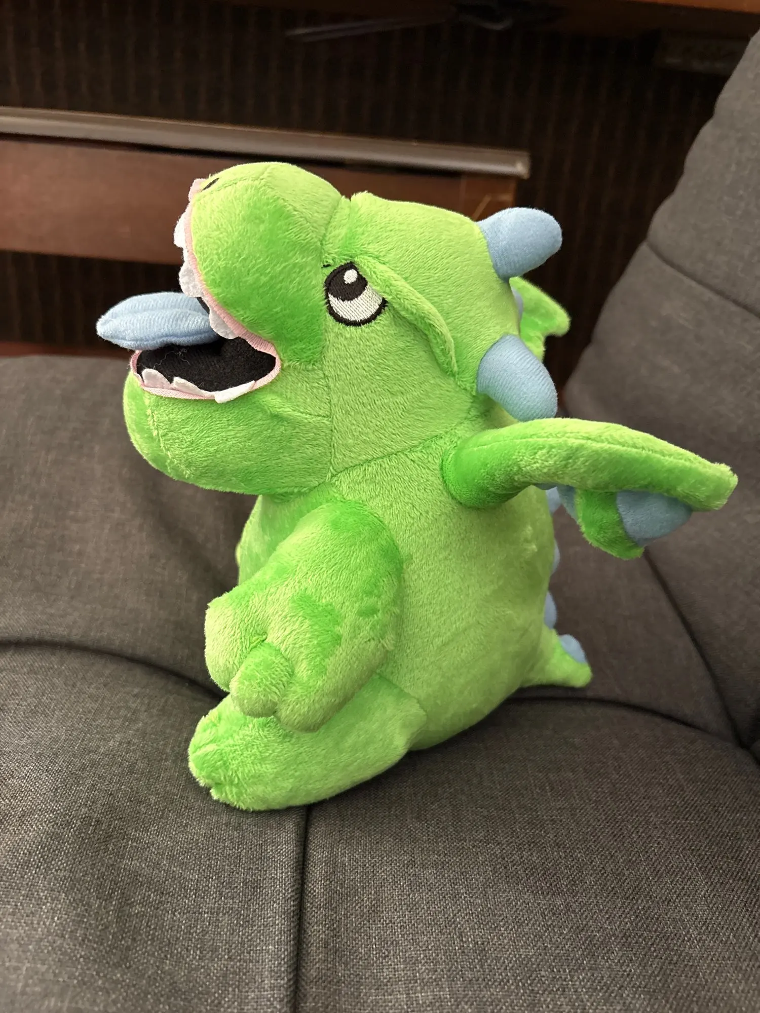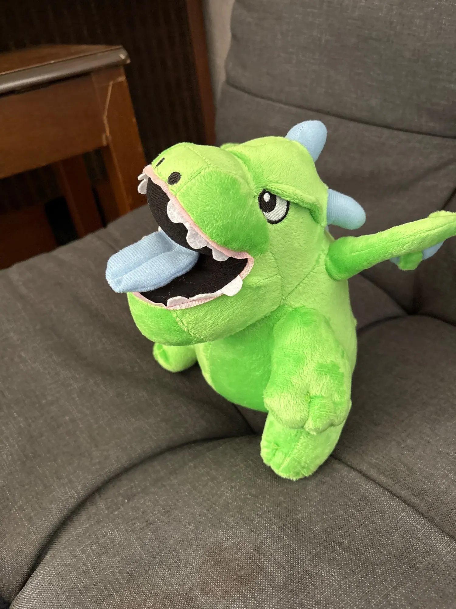 Details: Bright green body, little horns, and playful smile just like in-game